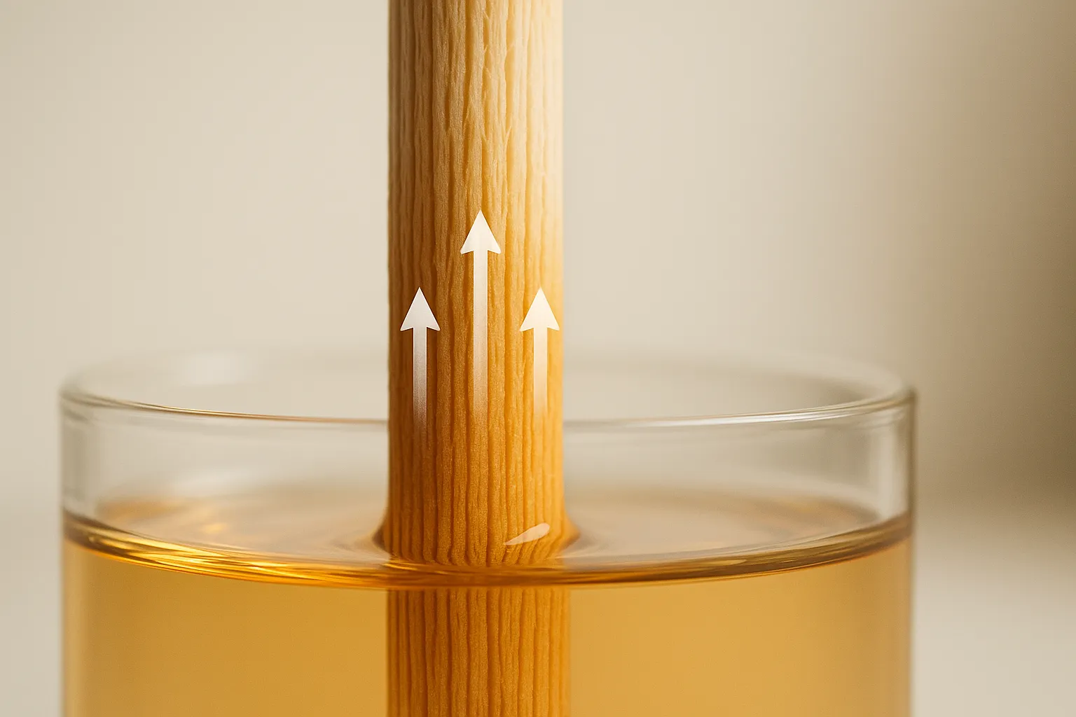 A capilaridade é o movimento espontâneo de um líquido por estruturas estreitas e porosas devido ao balanço entre forças coesivas (atração entre moléculas do líquido) e forças adesivas (atração entre o líquido e a superfície sólida das fibras). Quando a adesão às fibras supera a coesão interna, o líquido “vence” a gravidade e sobe. As varetas, portanto, formam uma coluna líquida contínua que conecta o frasco ao ar ambiente.